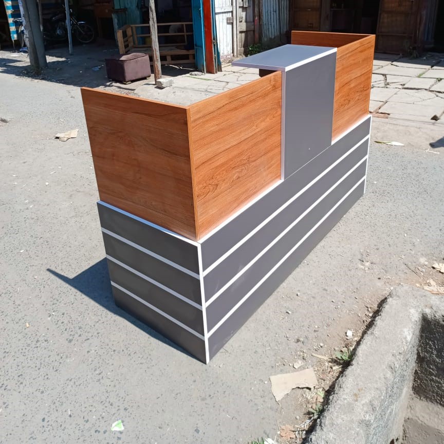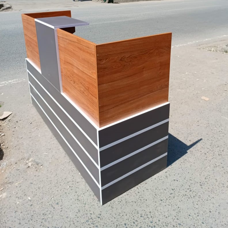 The high counter section adds privacy for the receptionist while maintaining a welcoming atmosphere for visitors. The desk’s durable construction ensures long-term use, while the wood and grey finish is easy to maintain and adds an elegant touch to the overall design.