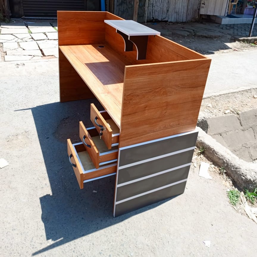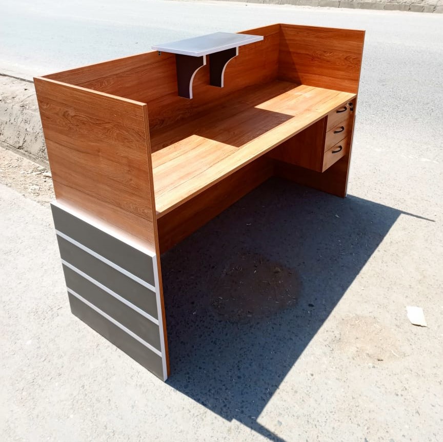 The desk features a sleek combination of wood and grey paneling, giving it a contemporary look that blends well with various décor styles. Its spacious 1.8-meter length provides ample workspace for reception tasks, such as welcoming guests, handling paperwork, or using computers. The desk comes equipped with built-in drawers, offering plenty of storage for organizing office supplies, files, and other essentials, keeping the workspace neat and clutter-free.