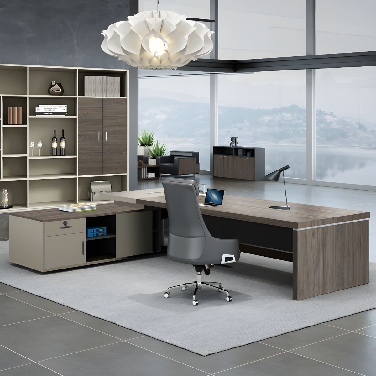 - Integrated Storage: Features built-in drawers, filing cabinets, and side compartments for organized storage of documents, office supplies, and personal items.
