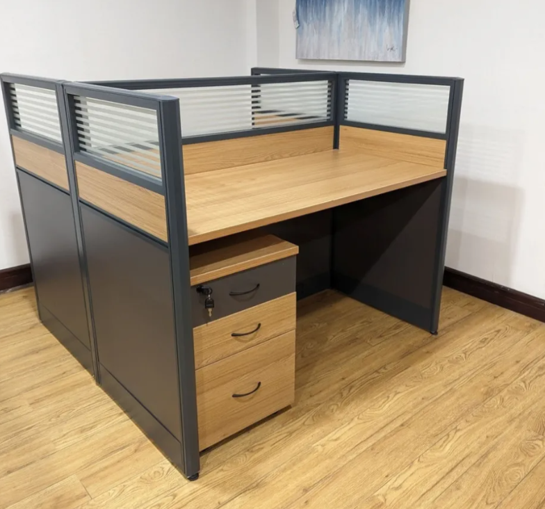 - The workstation includes a partition panel that separates the two workspaces. This feature creates privacy and reduces distractions, helping users stay focused on their tasks.