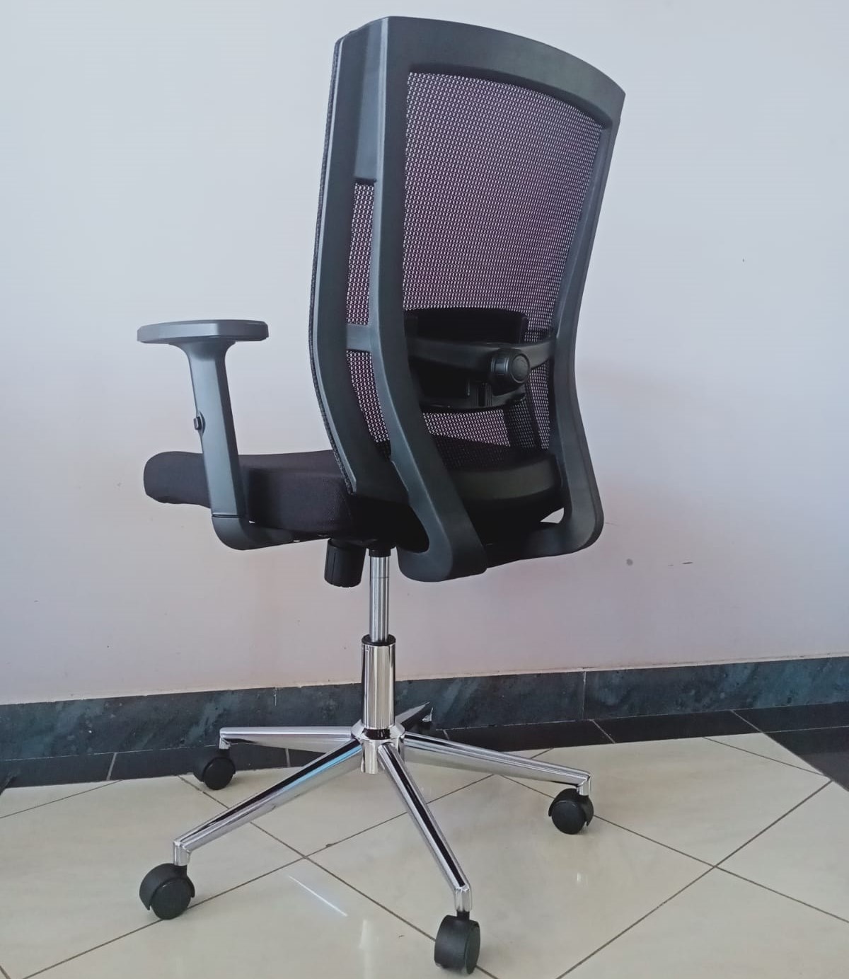 The chair is equipped with height-adjustable armrests that allow you to personalize your seating experience to suit your desk height or comfort preferences. The sturdy, chrome-plated base and smooth-rolling casters provide mobility, while the tilt mechanism enables a relaxed reclining position during breaks. This office chair is perfect for a variety of office environments, offering a modern, professional look combined with ergonomic support.