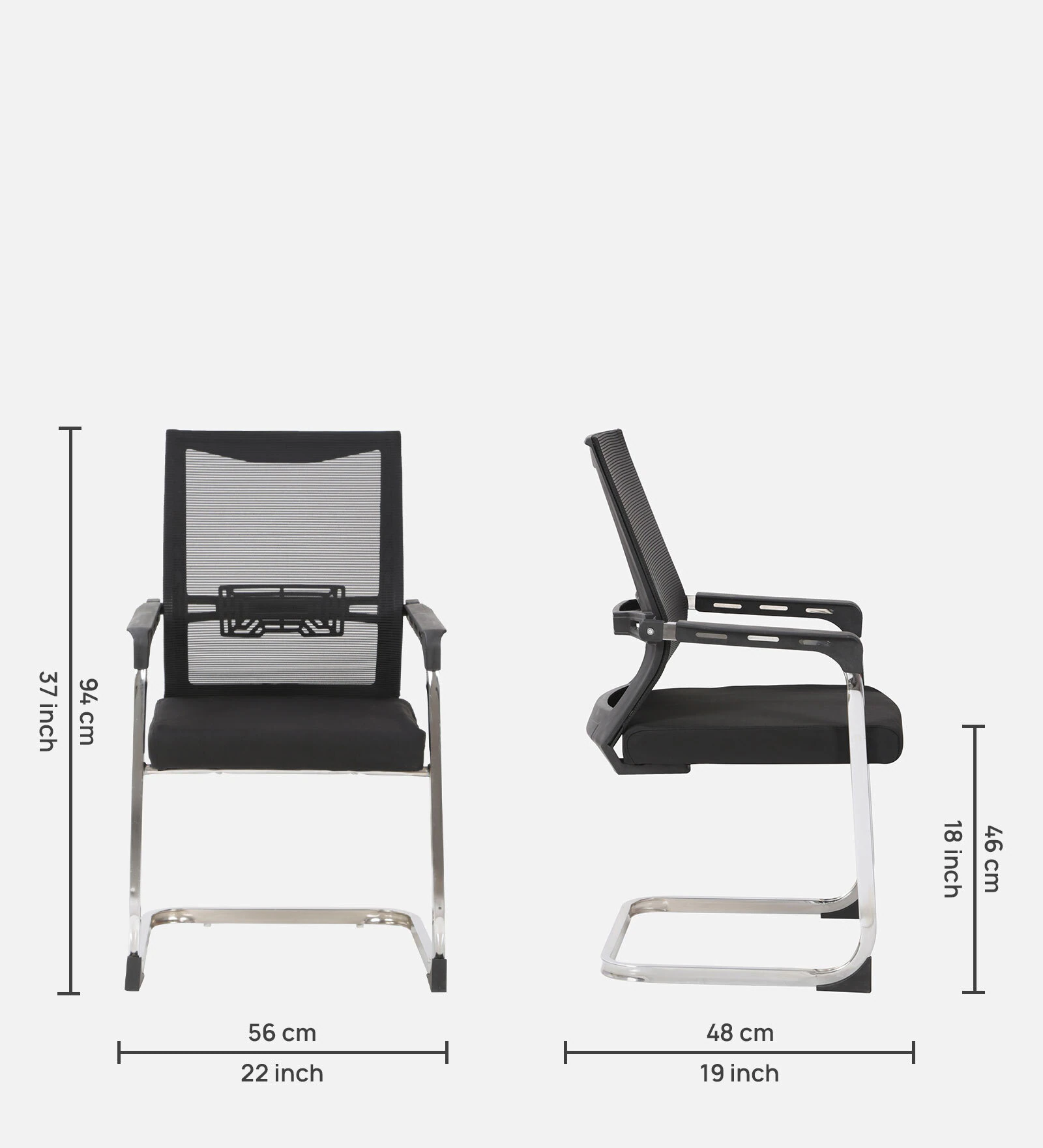 The seat is padded with high-density foam for comfort and covered in durable fabric. The cantilever design features a strong steel frame and a sleek chrome base.