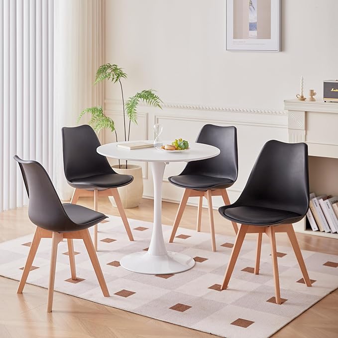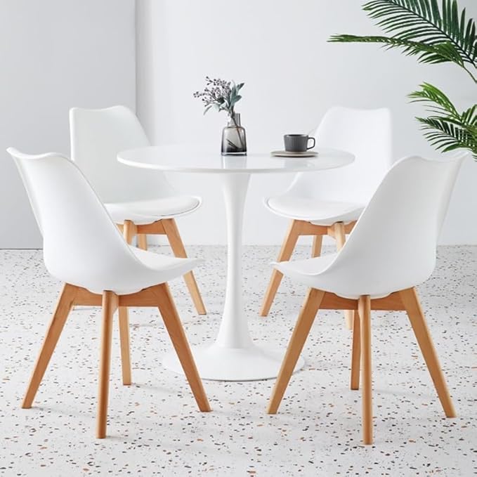 This modern 5-piece dining set includes a round pedestal table and four Eames-style chairs with wooden legs, perfect for kitchens, dining rooms, or coffee areas. Stylish, compact, and comfortable for any modern home.